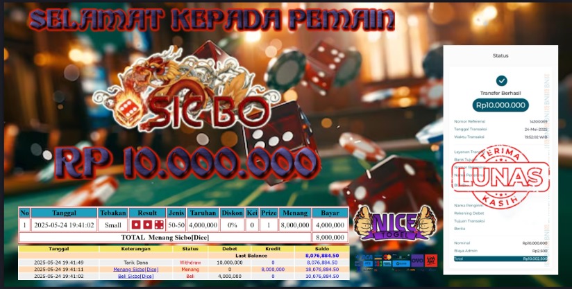 Selamat kepada User id : KDK* Telah berhasil mendapatkan kemenangan besar pada permainan LIVE MEGA SICBO Dengan kemenangan Sebesar Rp.10.000.000,- Setelah mengisi formulir withdraw dengan kurung waktu hanya 5 – 10 menit pihak NICETOGEL sudah melakukan transfer kepada pemilik Userid dan dana sudah dapat di cairkan oleh pemenang. Bukti pembayaran yang kami berikan merupakan bukti pembayaran yang SAH / VALID yang langung di dapatkan melaui tanda transfer transaksi dari Bank yang di tuju.