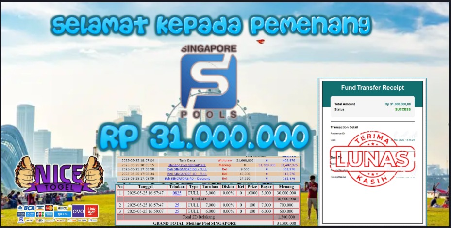 Selamat kepada member NICETOGEL User id :MGJ** Telah berhasil mendapatkan kemenangan besar pada permainan TOGEL SINGAPORE Dengan kemenangan Sebesar Rp.31.000.000,- Setelah mengisi formulir withdraw dengan kurung waktu hanya 5 – 10 menit pihak NICETOGEL sudah melakukan transfer kepada pemilik Userid dan dana sudah dapat di cairkan oleh pemenang. Bukti pembayaran yang kami berikan merupakan bukti pembayaran yang SAH / VALID yang langung di dapatkan melaui tanda transfer transaksi dari Bank yang di tuju.