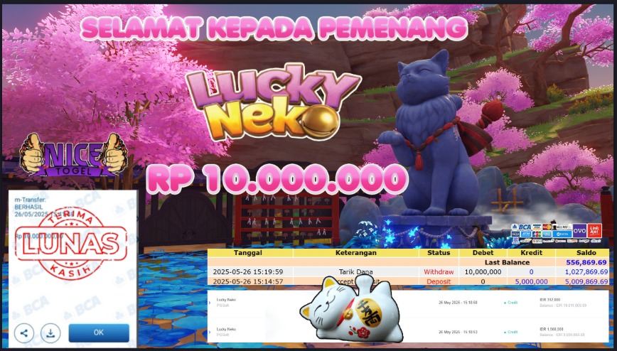 Selamat kepada User id : NMF** Telah berhasil mendapatkan kemenangan besar pada permainan SLOT LUCKY NEKO Dengan kemenangan Sebesar Rp.10.000.000,- Setelah mengisi formulir withdraw dengan kurung waktu hanya 5 – 10 menit pihak NICETOGEL sudah melakukan transfer kepada pemilik Userid dan dana sudah dapat di cairkan oleh pemenang. Bukti pembayaran yang kami berikan merupakan bukti pembayaran yang SAH / VALID yang langung di dapatkan melaui tanda transfer transaksi dari Bank yang di tuju.