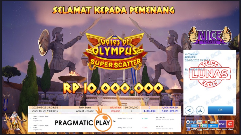 Selamat kepada member NICETOGEL User id LGK** Telah berhasil mendapatkan kemenangan besar pada permainan SLOT GATES OF OLYMPUS SUPER SCATTER Dengan kemenangan Sebesar Rp 10.000.000,- Setelah mengisi formulir withdraw dengan kurung waktu hanya 5 – 10 menit pihak NICETOGEL sudah melakukan transfer kepada pemilik Userid dan dana sudah dapat di cairkan oleh pemenang. Bukti pembayaran yang kami berikan merupakan bukti pembayaran yang SAH / VALID yang langung di dapatkan melaui tanda transfer transaksi dari Bank yang di tuju.