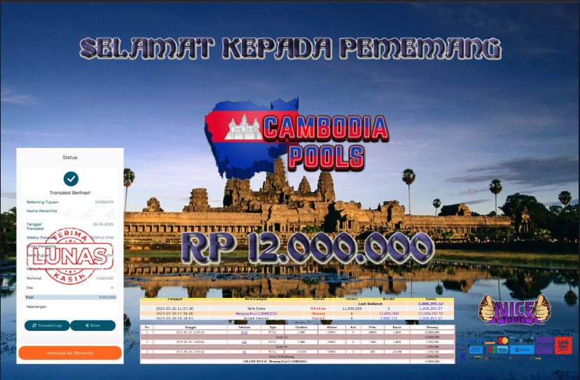 Selamat kepada member NICETOGEL User id : LGK** Telah berhasil mendapatkan kemenangan besar pada permainan TOGEL CAMBODIA POOLS Dengan kemenangan Sebesar Rp 12.000.000,- Setelah mengisi formulir withdraw dengan kurung waktu hanya 5 – 10 menit pihak NICETOGEL sudah melakukan transfer kepada pemilik Userid dan dana sudah dapat di cairkan oleh pemenang. Bukti pembayaran yang kami berikan merupakan bukti pembayaran yang SAH / VALID yang langung di dapatkan melaui tanda transfer transaksi dari Bank yang di tuju.