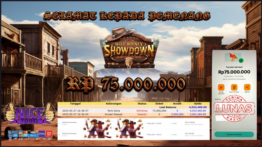Selamat kepada member NICETOGEL User id : MUL** Telah berhasil mendapatkan kemenangan besar pada permainan SLOT WILD BOUNTY SHOWDOWN Dengan kemenangan Sebesar Rp 75.000.000,- Setelah mengisi formulir withdraw dengan kurung waktu hanya 5 – 10 menit pihak NICETOGEL sudah melakukan transfer kepada pemilik Userid dan dana sudah dapat di cairkan oleh pemenang. Bukti pembayaran yang kami berikan merupakan bukti pembayaran yang SAH / VALID yang langung di dapatkan melaui tanda transfer transaksi dari Bank yang di tuju.