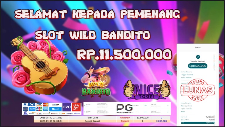 Selamat kepada member NICETOGEL User id :KFK** Telah berhasil mendapatkan kemenangan besar pada permainan SLOT WILD BANDITO Dengan kemenangan Sebesar Rp.11.500.000,- Setelah mengisi formulir withdraw dengan kurung waktu hanya 5 – 10 menit pihak NICETOGEL sudah melakukan transfer kepada pemilik Userid dan dana sudah dapat di cairkan oleh pemenang. Bukti pembayaran yang kami berikan merupakan bukti pembayaran yang SAH / VALID yang langung di dapatkan melaui tanda transfer transaksi dari Bank yang di tuju.