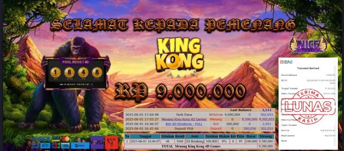 Selamat kepada member NICETOGEL User id : KIY** Telah berhasil mendapatkan kemenangan besar pada permainan TOGEL KINGKONG 4D Dengan kemenangan Sebesar Rp.9.000.000 ,- Setelah mengisi formulir withdraw dengan kurung waktu hanya 5 – 10 menit pihak NICETOGEL sudah melakukan transfer kepada pemilik Userid dan dana sudah dapat di cairkan oleh pemenang. Bukti pembayaran yang kami berikan merupakan bukti pembayaran yang SAH / VALID yang langung di dapatkan melaui tanda transfer transaksi dari Bank yang di tuju.