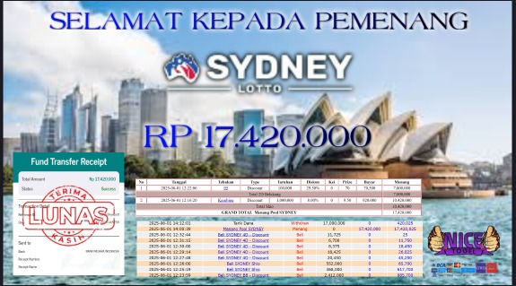 Selamat kepada User id : LOS** Telah berhasil mendapatkan kemenangan besar pada permainan TOGEL SYDNEY LOTTO Dengan kemenangan Sebesar Rp.17.420.000,- Setelah mengisi formulir withdraw dengan kurung waktu hanya 5 – 10 menit pihak NICETOGEL sudah melakukan transfer kepada pemilik Userid dan dana sudah dapat di cairkan oleh pemenang. Bukti pembayaran yang kami berikan merupakan bukti pembayaran yang SAH / VALID yang langung di dapatkan melaui tanda transfer transaksi dari Bank yang di tuju.