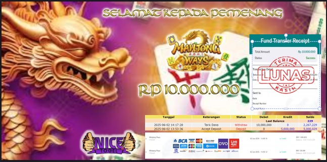 Selamat kepada member NICETOGEL User id :YSH** Telah berhasil mendapatkan kemenangan besar pada permainan SLOT MAHYONG WAYS Dengan kemenangan Sebesar Rp.10.000.000,- Setelah mengisi formulir withdraw dengan kurung waktu hanya 5 – 10 menit pihak NICETOGEL sudah melakukan transfer kepada pemilik Userid dan dana sudah dapat di cairkan oleh pemenang. Bukti pembayaran yang kami berikan merupakan bukti pembayaran yang SAH / VALID yang langung di dapatkan melaui tanda transfer transaksi dari Bank yang di tuju.