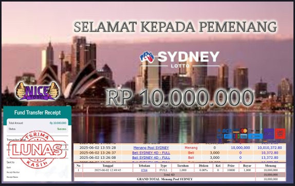 Selamat kepada User id : FDT** Telah berhasil mendapatkan kemenangan besar pada permainan TOGEL SYDNEY LOTTO Dengan kemenangan Sebesar Rp.10.000.000,- Setelah mengisi formulir withdraw dengan kurung waktu hanya 5 – 10 menit pihak NICETOGEL sudah melakukan transfer kepada pemilik Userid dan dana sudah dapat di cairkan oleh pemenang. Bukti pembayaran yang kami berikan merupakan bukti pembayaran yang SAH / VALID yang langung di dapatkan melaui tanda transfer transaksi dari Bank yang di tuju.