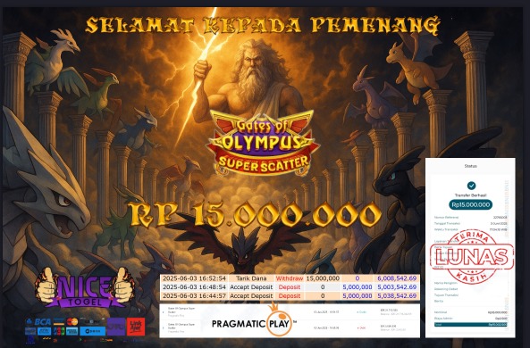 Selamat kepada member NICETOGEL User id : CRT** Telah berhasil mendapatkan kemenangan besar pada permainan SLOT GATES OF OLYMPUS SUPER SCATTER Dengan kemenangan Sebesar Rp.15.000.000,- Setelah mengisi formulir withdraw dengan kurung waktu hanya 5 – 10 menit pihak NICETOGEL sudah melakukan transfer kepada pemilik Userid dan dana sudah dapat di cairkan oleh pemenang. Bukti pembayaran yang kami berikan merupakan bukti pembayaran yang SAH / VALID yang langung di dapatkan melaui tanda transfer transaksi dari Bank yang di tuju.