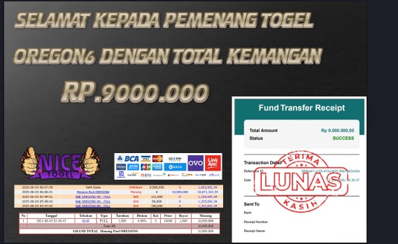 Selamat kepada User id : KDJ*** Telah berhasil mendapatkan kemenangan besar pada permainan TOGEL OREGON 6 Dengan kemenangan Sebesar Rp.9.000.000,- Setelah mengisi formulir withdraw dengan kurung waktu hanya 5 – 10 menit pihak NICETOGEL sudah melakukan transfer kepada pemilik Userid dan dana sudah dapat di cairkan oleh pemenang. Bukti pembayaran yang kami berikan merupakan bukti pembayaran yang SAH / VALID yang langung di dapatkan melaui tanda transfer transaksi dari Bank yang di tuju.