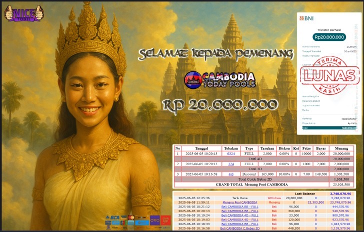 Selamat kepada member NICETOGEL User id : CRT** Telah berhasil mendapatkan kemenangan besar pada permainan JACKPOT TOGEL CAMBODIA POOLS Dengan kemenangan Sebesar Rp.20.000.000,- Setelah mengisi formulir withdraw dengan kurung waktu hanya 5 – 10 menit pihak NICETOGEL sudah melakukan transfer kepada pemilik Userid dan dana sudah dapat di cairkan oleh pemenang. Bukti pembayaran yang kami berikan merupakan bukti pembayaran yang SAH / VALID yang langung di dapatkan melaui tanda transfer transaksi dari Bank yang di tuju.
