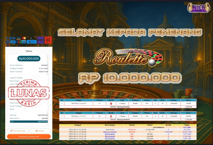 Selamat kepada member NICETOGEL User id : RET** Telah berhasil mendapatkan kemenangan besar pada permainan SLOT MANIA ROULETTE Dengan kemenangan Sebesar Rp.10.000.000,- Setelah mengisi formulir withdraw dengan kurung waktu hanya 5 – 10 menit pihak NICETOGEL sudah melakukan transfer kepada pemilik Userid dan dana sudah dapat di cairkan oleh pemenang. Bukti pembayaran yang kami berikan merupakan bukti pembayaran yang SAH / VALID yang langung di dapatkan melaui tanda transfer transaksi dari Bank yang di tuju.