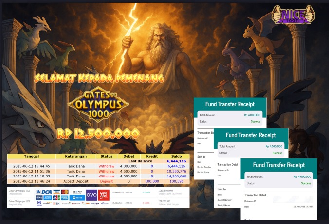 Selamat kepada User id : HGF*** Telah berhasil mendapatkan kemenangan besar pada permainan BUKTI JACKPOT SLOT GATES OF OLYMPUS 1000 Dengan kemenangan Sebesar Rp.12.500.000,- Setelah mengisi formulir withdraw dengan kurung waktu hanya 5 – 10 menit pihak NICETOGEL sudah melakukan transfer kepada pemilik Userid dan dana sudah dapat di cairkan oleh pemenang. Bukti pembayaran yang kami berikan merupakan bukti pembayaran yang SAH / VALID yang langung di dapatkan melaui tanda transfer transaksi dari Bank yang di tuju.
