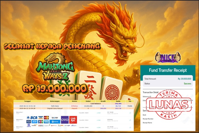 Selamat kepada User id : RTS*** Telah berhasil mendapatkan kemenangan besar pada permainan SLOT MAHYONG WAYS 2 Dengan kemenangan Sebesar Rp.19.000.000,- Setelah mengisi formulir withdraw dengan kurung waktu hanya 5 – 10 menit pihak NICETOGEL sudah melakukan transfer kepada pemilik Userid dan dana sudah dapat di cairkan oleh pemenang. Bukti pembayaran yang kami berikan merupakan bukti pembayaran yang SAH / VALID yang langung di dapatkan melaui tanda transfer transaksi dari Bank yang di tuju.