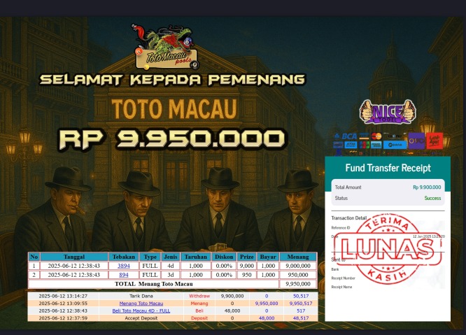 Selamat kepada member NICETOGEL User id :NHD** Telah berhasil mendapatkan kemenangan besar pada permainan TOGEL TOTO MACAU Dengan kemenangan Sebesar Rp.9.950.000,- Setelah mengisi formulir withdraw dengan kurung waktu hanya 5 – 10 menit pihak NICETOGEL sudah melakukan transfer kepada pemilik Userid dan dana sudah dapat di cairkan oleh pemenang. Bukti pembayaran yang kami berikan merupakan bukti pembayaran yang SAH / VALID yang langung di dapatkan melaui tanda transfer transaksi dari Bank yang di tuju.