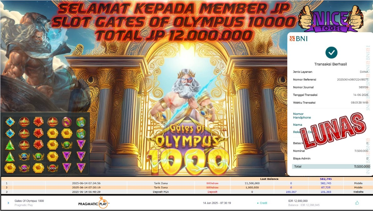 Selamat kepada User id : kej*** Telah berhasil mendapatkan kemenangan besar pada permainan BUKTI JACKPOT SLOT GATES OF OLYMPUS 1000 Dengan kemenangan Sebesar Rp.12.000.000,- Setelah mengisi formulir withdraw dengan kurung waktu hanya 5 – 10 menit pihak NICETOGEL sudah melakukan transfer kepada pemilik Userid dan dana sudah dapat di cairkan oleh pemenang. Bukti pembayaran yang kami berikan merupakan bukti pembayaran yang SAH / VALID yang langung di dapatkan melaui tanda transfer transaksi dari Bank yang di tuju.