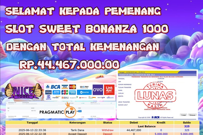Selamat kepada User id : RGT56*** Telah berhasil mendapatkan kemenangan besar pada permainan BUKTI JACKPOT SLOT SWET BONANZA 1000 Dengan kemenangan Sebesar Rp.44.467.000.00,- Setelah mengisi formulir withdraw dengan kurung waktu hanya 5 – 10 menit pihak NICETOGEL sudah melakukan transfer kepada pemilik Userid dan dana sudah dapat di cairkan oleh pemenang. Bukti pembayaran yang kami berikan merupakan bukti pembayaran yang SAH / VALID yang langung di dapatkan melaui tanda transfer transaksi dari Bank yang di tuju.