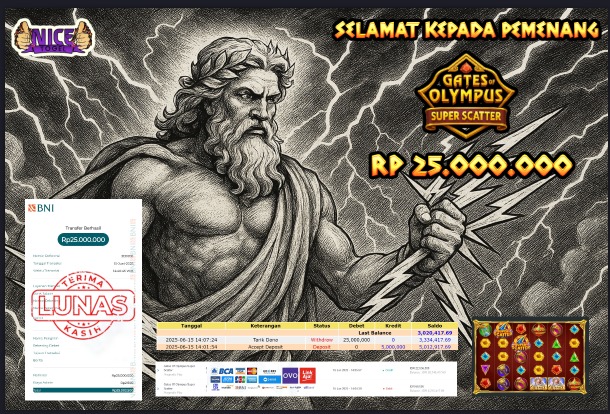 Selamat kepada member NICETOGEL User id : MIH** Telah berhasil mendapatkan kemenangan besar pada permainan SLOT GATES OF OLYMPUS SUPER SCATTER Dengan kemenangan Sebesar Rp.25.000.000,- Setelah mengisi formulir withdraw dengan kurung waktu hanya 5 – 10 menit pihak NICETOGEL sudah melakukan transfer kepada pemilik Userid dan dana sudah dapat di cairkan oleh pemenang. Bukti pembayaran yang kami berikan merupakan bukti pembayaran yang SAH / VALID yang langung di dapatkan melaui tanda transfer transaksi dari Bank yang di tuju.