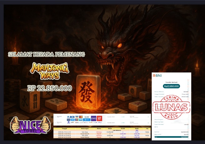 Selamat kepada User id : PHD*** Telah berhasil mendapatkan kemenangan besar pada permainan SLOT MAHYONG WAYS Dengan kemenangan Sebesar Rp.22.850.000,- Setelah mengisi formulir withdraw dengan kurung waktu hanya 5 – 10 menit pihak NICETOGEL sudah melakukan transfer kepada pemilik Userid dan dana sudah dapat di cairkan oleh pemenang. Bukti pembayaran yang kami berikan merupakan bukti pembayaran yang SAH / VALID yang langung di dapatkan melaui tanda transfer transaksi dari Bank yang di tuju.