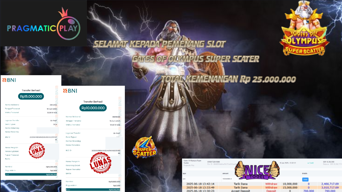 Selamat kepada member NICETOGEL User id : JEM** Telah berhasil mendapatkan kemenangan besar pada permainan SLOT GATES OF OLYMPUS SUPER SCATTER Dengan kemenangan Sebesar Rp.25.000.000,- Setelah mengisi formulir withdraw dengan kurung waktu hanya 5 – 10 menit pihak NICETOGEL sudah melakukan transfer kepada pemilik Userid dan dana sudah dapat di cairkan oleh pemenang. Bukti pembayaran yang kami berikan merupakan bukti pembayaran yang SAH / VALID yang langung di dapatkan melaui tanda transfer transaksi dari Bank yang di tuju.