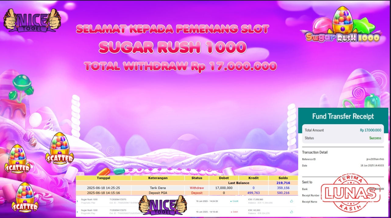 Selamat kepada User id : JURY*** Telah berhasil mendapatkan kemenangan besar pada permainan BUKTI JACKPOT SUGAR RUSH 1000 Dengan kemenangan Sebesar Rp.17.000.000.00,- Setelah mengisi formulir withdraw dengan kurung waktu hanya 5 – 10 menit pihak NICETOGEL sudah melakukan transfer kepada pemilik Userid dan dana sudah dapat di cairkan oleh pemenang. Bukti pembayaran yang kami berikan merupakan bukti pembayaran yang SAH / VALID yang langung di dapatkan melaui tanda transfer transaksi dari Bank yang di tuju.