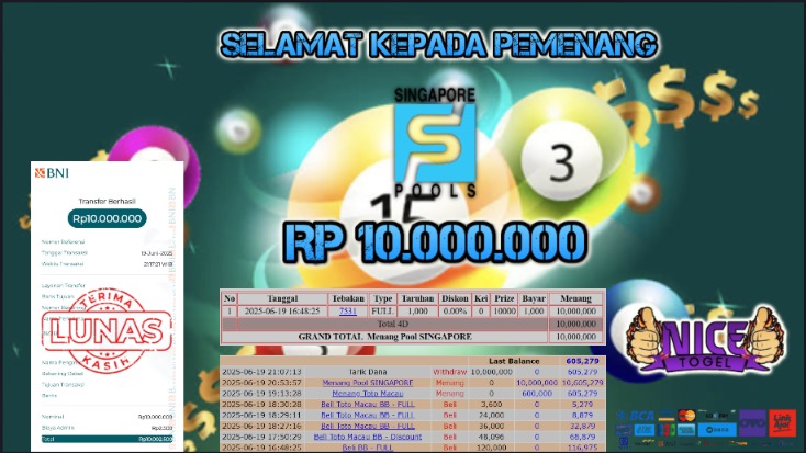 Selamat kepada User id : JHU*** Telah berhasil mendapatkan kemenangan besar pada permainan JACKPOT TOGEL SINGAPORE Dengan kemenangan Sebesar Rp.10.000.000,- Setelah mengisi formulir withdraw dengan kurung waktu hanya 5 – 10 menit pihak NICETOGEL sudah melakukan transfer kepada pemilik Userid dan dana sudah dapat di cairkan oleh pemenang. Bukti pembayaran yang kami berikan merupakan bukti pembayaran yang SAH / VALID yang langung di dapatkan melaui tanda transfer transaksi dari Bank yang di tuju.
