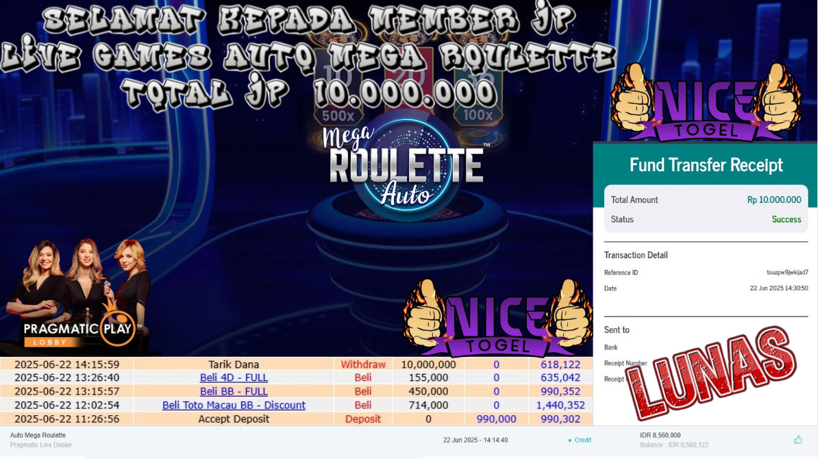 Selamat kepada User id : m*a* Telah berhasil mendapatkan kemenangan besar pada permainan AUTO MEGA ROULETTE Dengan kemenangan Sebesar Rp.10.000.000,- Setelah mengisi formulir withdraw dengan kurung waktu hanya 5 – 10 menit pihak NICETOGEL sudah melakukan transfer kepada pemilik Userid dan dana sudah dapat di cairkan oleh pemenang. Bukti pembayaran yang kami berikan merupakan bukti pembayaran yang SAH / VALID yang langung di dapatkan melaui tanda transfer transaksi dari Bank yang di tuju.