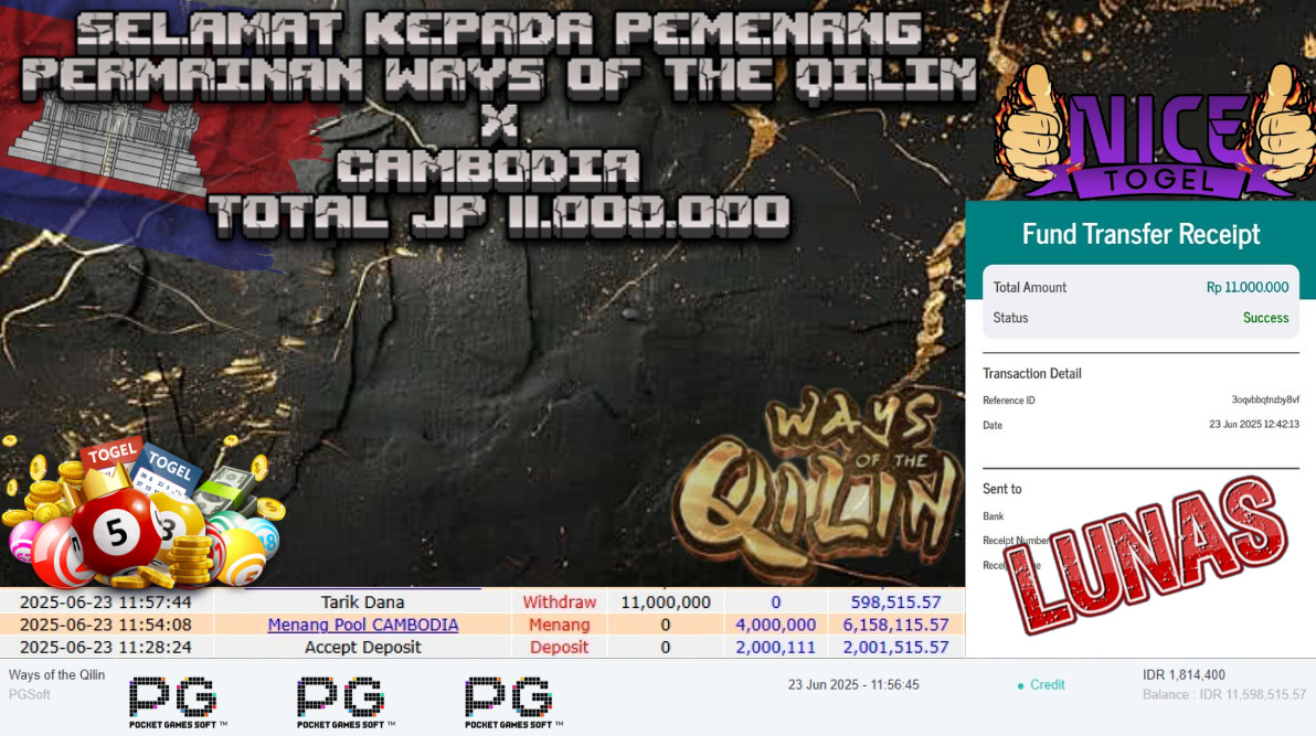 Selamat kepada User id : 45*a* Telah berhasil mendapatkan kemenangan besar pada permainan SLOT WAYS OF THE QILIN DAN CAMBODIA POOLS Dengan kemenangan Sebesar Rp.11.000.000,- Setelah mengisi formulir withdraw dengan kurung waktu hanya 5 – 10 menit pihak NICETOGEL sudah melakukan transfer kepada pemilik Userid dan dana sudah dapat di cairkan oleh pemenang. Bukti pembayaran yang kami berikan merupakan bukti pembayaran yang SAH / VALID yang langung di dapatkan melaui tanda transfer transaksi dari Bank yang di tuju.