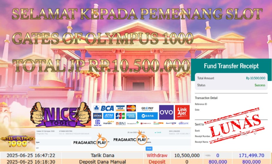 Selamat kepada member NICETOGEL User id :JAM**** Telah berhasil mendapatkan kemenangan besar pada permainan SLOT GATES OF OLYMPUS 1000 Dengan kemenangan Sebesar Rp.10.500.000,- Setelah mengisi formulir withdraw dengan kurung waktu hanya 5 – 10 menit pihak NICETOGEL sudah melakukan transfer kepada pemilik Userid dan dana sudah dapat di cairkan oleh pemenang. Bukti pembayaran yang kami berikan merupakan bukti pembayaran yang SAH / VALID yang langung di dapatkan melaui tanda transfer transaksi dari Bank yang di tuju.