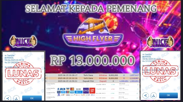 Selamat kepada member NICETOGEL User id :RFE**** Telah berhasil mendapatkan kemenangan besar pada permainan SLOT MANIA HIGH FLYER Dengan kemenangan Sebesar Rp.13.000.000,- Setelah mengisi formulir withdraw dengan kurung waktu hanya 5 – 10 menit pihak NICETOGEL sudah melakukan transfer kepada pemilik Userid dan dana sudah dapat di cairkan oleh pemenang. Bukti pembayaran yang kami berikan merupakan bukti pembayaran yang SAH / VALID yang langung di dapatkan melaui tanda transfer transaksi dari Bank yang di tuju.
