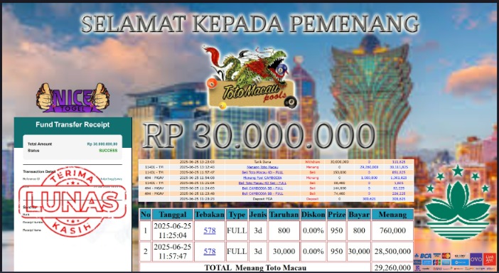 Selamat kepada member NICETOGEL User id :NJU**** Telah berhasil mendapatkan kemenangan besar pada permainan TOGEL TOTO MACAU Dengan kemenangan Sebesar Rp.30.000.000,- Setelah mengisi formulir withdraw dengan kurung waktu hanya 5 – 10 menit pihak NICETOGEL sudah melakukan transfer kepada pemilik Userid dan dana sudah dapat di cairkan oleh pemenang. Bukti pembayaran yang kami berikan merupakan bukti pembayaran yang SAH / VALID yang langung di dapatkan melaui tanda transfer transaksi dari Bank yang di tuju.