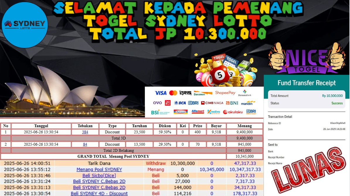Selamat kepada member NICETOGEL User id :KIY**** Telah berhasil mendapatkan kemenangan besar pada permainan JACKPOT TOGEL SYDNEY LOTTO Dengan kemenangan Sebesar Rp.10.300.0000,- Setelah mengisi formulir withdraw dengan kurung waktu hanya 5 – 10 menit pihak NICETOGEL sudah melakukan transfer kepada pemilik Userid dan dana sudah dapat di cairkan oleh pemenang. Bukti pembayaran yang kami berikan merupakan bukti pembayaran yang SAH / VALID yang langung di dapatkan melaui tanda transfer transaksi dari Bank yang di tuju.