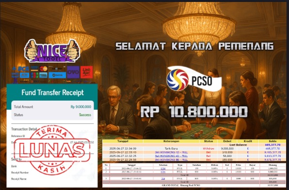 Selamat kepada member NICETOGEL User id :KIY**** Telah berhasil mendapatkan kemenangan besar pada permainan JACKPOT TOGEL PCSO Dengan kemenangan Sebesar Rp.10.800.000,- Setelah mengisi formulir withdraw dengan kurung waktu hanya 5 – 10 menit pihak NICETOGEL sudah melakukan transfer kepada pemilik Userid dan dana sudah dapat di cairkan oleh pemenang. Bukti pembayaran yang kami berikan merupakan bukti pembayaran yang SAH / VALID yang langung di dapatkan melaui tanda transfer transaksi dari Bank yang di tuju.
