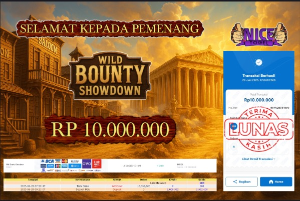 Selamat kepada member NICETOGEL User id :VFD**** Telah berhasil mendapatkan kemenangan besar pada permainan JACKPOT SLOT WILD BOUNTY SHOWDOWN Dengan kemenangan Sebesar Rp.10.000.000,- Setelah mengisi formulir withdraw dengan kurung waktu hanya 5 – 10 menit pihak NICETOGEL sudah melakukan transfer kepada pemilik Userid dan dana sudah dapat di cairkan oleh pemenang. Bukti pembayaran yang kami berikan merupakan bukti pembayaran yang SAH / VALID yang langung di dapatkan melaui tanda transfer transaksi dari Bank yang di tuju.