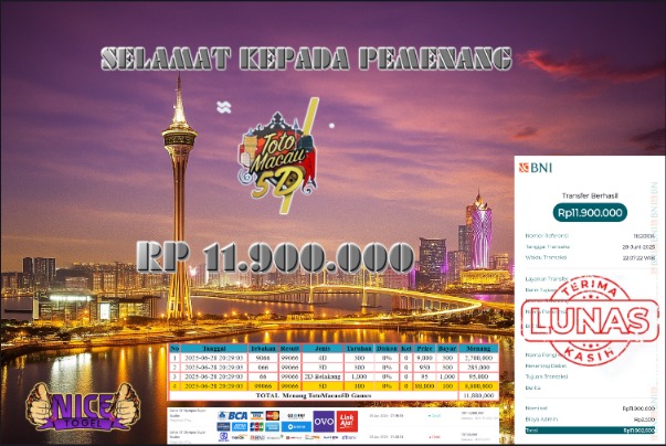 Selamat kepada member NICETOGEL User id :BUH**** Telah berhasil mendapatkan kemenangan besar pada permainan JACKPOT TOGEL TOTO MACAU 5D Dengan kemenangan Sebesar Rp.11.900.000,- Setelah mengisi formulir withdraw dengan kurung waktu hanya 5 – 10 menit pihak NICETOGEL sudah melakukan transfer kepada pemilik Userid dan dana sudah dapat di cairkan oleh pemenang. Bukti pembayaran yang kami berikan merupakan bukti pembayaran yang SAH / VALID yang langung di dapatkan melaui tanda transfer transaksi dari Bank yang di tuju.