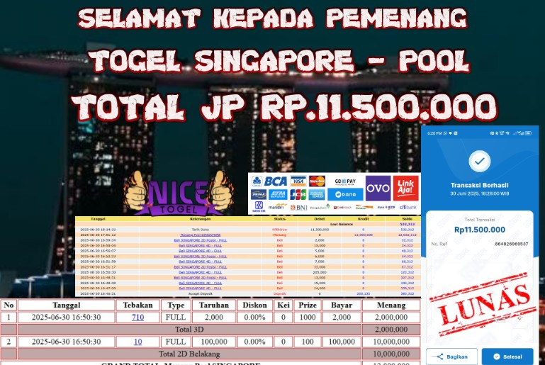 Selamat kepada User id : JJ7*** Telah berhasil mendapatkan kemenangan besar pada permainan JACKPOT TOGEL SINGAPORE Dengan kemenangan Sebesar Rp.11.500.000,- Setelah mengisi formulir withdraw dengan kurung waktu hanya 5 – 10 menit pihak NICETOGEL sudah melakukan transfer kepada pemilik Userid dan dana sudah dapat di cairkan oleh pemenang. Bukti pembayaran yang kami berikan merupakan bukti pembayaran yang SAH / VALID yang langung di dapatkan melaui tanda transfer transaksi dari Bank yang di tuju.
