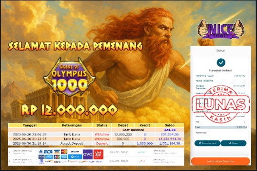 Selamat kepada User id : LOY*** Telah berhasil mendapatkan kemenangan besar pada permainan JACKPOT SLOT GATES OF OLYMPUS 1000 Dengan kemenangan Sebesar Rp.12.000.000,- Setelah mengisi formulir withdraw dengan kurung waktu hanya 5 – 10 menit pihak NICETOGEL sudah melakukan transfer kepada pemilik Userid dan dana sudah dapat di cairkan oleh pemenang. Bukti pembayaran yang kami berikan merupakan bukti pembayaran yang SAH / VALID yang langung di dapatkan melaui tanda transfer transaksi dari Bank yang di tuju.