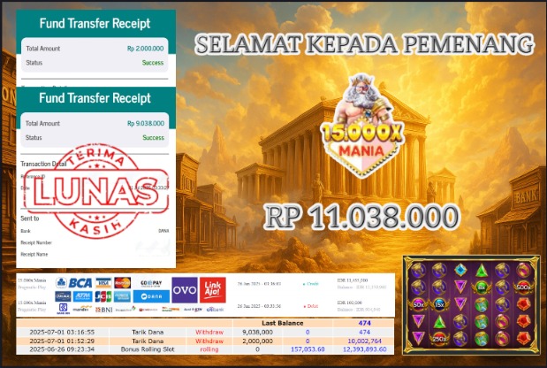 Selamat kepada User id : JUH*** Telah berhasil mendapatkan kemenangan besar pada permainan JACKPOT SLOT X15000 MANIA Dengan kemenangan Sebesar Rp.11.038.000,- Setelah mengisi formulir withdraw dengan kurung waktu hanya 5 – 10 menit pihak NICETOGEL sudah melakukan transfer kepada pemilik Userid dan dana sudah dapat di cairkan oleh pemenang. Bukti pembayaran yang kami berikan merupakan bukti pembayaran yang SAH / VALID yang langung di dapatkan melaui tanda transfer transaksi dari Bank yang di tuju.