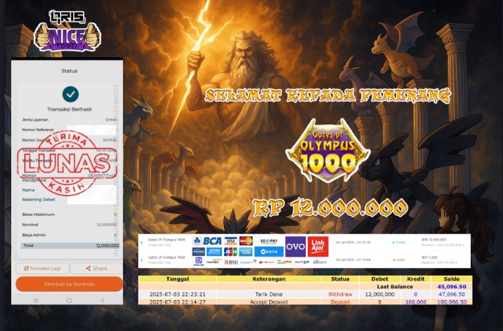 Selamat kepada User id : CHY*** Telah berhasil mendapatkan kemenangan besar pada permainan JACKPOT SLOT GATES OF OLYMPUS 1000 Dengan kemenangan Sebesar Rp.12.000.000,- Setelah mengisi formulir withdraw dengan kurung waktu hanya 5 – 10 menit pihak NICETOGEL sudah melakukan transfer kepada pemilik Userid dan dana sudah dapat di cairkan oleh pemenang. Bukti pembayaran yang kami berikan merupakan bukti pembayaran yang SAH / VALID yang langung di dapatkan melaui tanda transfer transaksi dari Bank yang di tuju.
