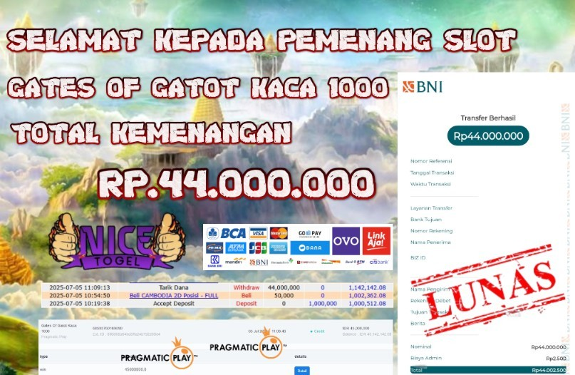 Selamat kepada member NICETOGEL User id :7YT** Telah berhasil mendapatkan kemenangan besar pada permainan SLOT GATES OF GATOT KACA 1000 Dengan kemenangan Sebesar Rp.44.000.000,- Setelah mengisi formulir withdraw dengan kurung waktu hanya 5 – 10 menit pihak NICETOGEL sudah melakukan transfer kepada pemilik Userid dan dana sudah dapat di cairkan oleh pemenang. Bukti pembayaran yang kami berikan merupakan bukti pembayaran yang SAH / VALID yang langung di dapatkan melaui tanda transfer transaksi dari Bank yang di tuju.