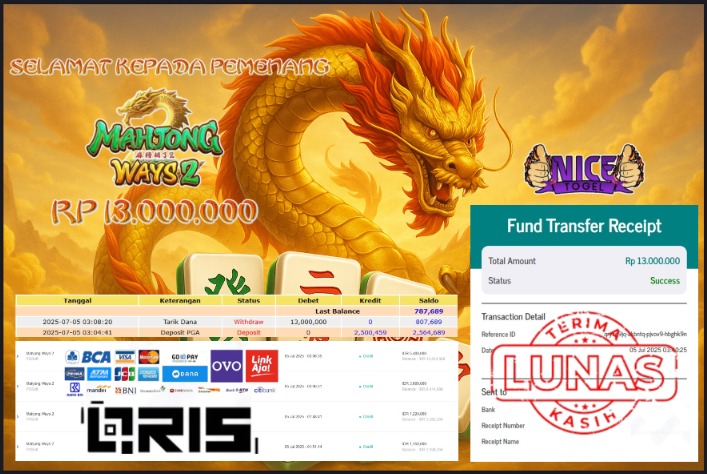 Selamat kepada User id : ASD*** Telah berhasil mendapatkan kemenangan besar pada permainan SLOT MAHYONG WAYS 2 Dengan kemenangan Sebesar Rp.13.000.000,- Setelah mengisi formulir withdraw dengan kurung waktu hanya 5 – 10 menit pihak NICETOGEL sudah melakukan transfer kepada pemilik Userid dan dana sudah dapat di cairkan oleh pemenang. Bukti pembayaran yang kami berikan merupakan bukti pembayaran yang SAH / VALID yang langung di dapatkan melaui tanda transfer transaksi dari Bank yang di tuju.