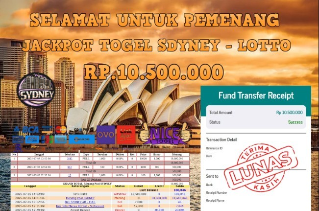 Selamat kepada member NICETOGEL User id :TAM1** Telah berhasil mendapatkan kemenangan besar pada permainan TOGEL SDYNEY LOTTO Dengan kemenangan Sebesar Rp.10.500.000,- Setelah mengisi formulir withdraw dengan kurung waktu hanya 5 – 10 menit pihak NICETOGEL sudah melakukan transfer kepada pemilik Userid dan dana sudah dapat di cairkan oleh pemenang. Bukti pembayaran yang kami berikan merupakan bukti pembayaran yang SAH / VALID yang langung di dapatkan melaui tanda transfer transaksi dari Bank yang di tuju.