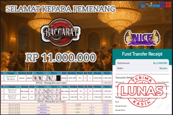 Selamat kepada User id : VEYY*** Telah berhasil mendapatkan kemenangan besar pada permainan BACCARAT Dengan kemenangan Sebesar Rp.11.000.000,- Setelah mengisi formulir withdraw dengan kurung waktu hanya 5 – 10 menit pihak NICETOGEL sudah melakukan transfer kepada pemilik Userid dan dana sudah dapat di cairkan oleh pemenang. Bukti pembayaran yang kami berikan merupakan bukti pembayaran yang SAH / VALID yang langung di dapatkan melaui tanda transfer transaksi dari Bank yang di tuju.