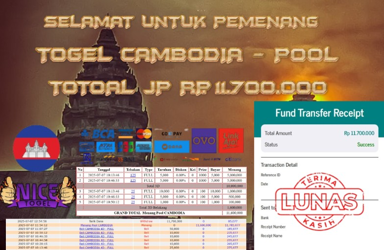 selamat kepada User id : JIM* Telah berhasil mendapatkan kemenangan besar pada permainan TOGEL CAMBODIA – POOL Dengan kemenangan Sebesar Rp.11.700.000,- Setelah mengisi formulir withdraw dengan kurung waktu hanya 5 – 10 menit pihak NICETOGEL sudah melakukan transfer kepada pemilik Userid dan dana sudah dapat di cairkan oleh pemenang. Bukti pembayaran yang kami berikan merupakan bukti pembayaran yang SAH / VALID yang langung di dapatkan melaui tanda transfer transaksi dari Bank yang di tuju.