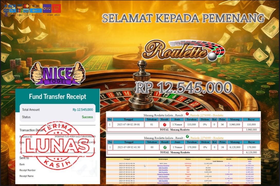 Selamat kepada member NICETOGEL User id : CRZ** Telah berhasil mendapatkan kemenangan besar pada permainan LIVE GAME ROULETTE Dengan kemenangan Sebesar Rp.12.545.000 ,- Setelah mengisi formulir withdraw dengan kurung waktu hanya 5 – 10 menit pihak NICETOGEL sudah melakukan transfer kepada pemilik Userid dan dana sudah dapat di cairkan oleh pemenang. Bukti pembayaran yang kami berikan merupakan bukti pembayaran yang SAH / VALID yang langung di dapatkan melaui tanda transfer transaksi dari Bank yang di tuju.