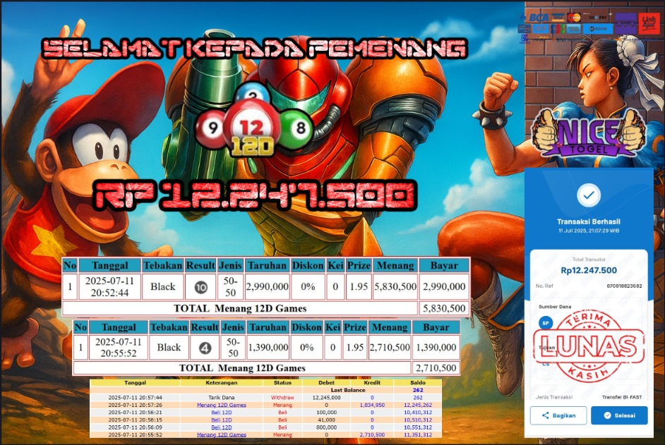 Selamat kepada User id : BHC*** Telah berhasil mendapatkan kemenangan besar pada permainan JACKPOT LIVE GAMES 12D Dengan kemenangan Sebesar Rp.12.247.000,- Setelah mengisi formulir withdraw dengan kurung waktu hanya 5 – 10 menit pihak NICETOGEL sudah melakukan transfer kepada pemilik Userid dan dana sudah dapat di cairkan oleh pemenang. Bukti pembayaran yang kami berikan merupakan bukti pembayaran yang SAH / VALID yang langung di dapatkan melaui tanda transfer transaksi dari Bank yang di tuju.