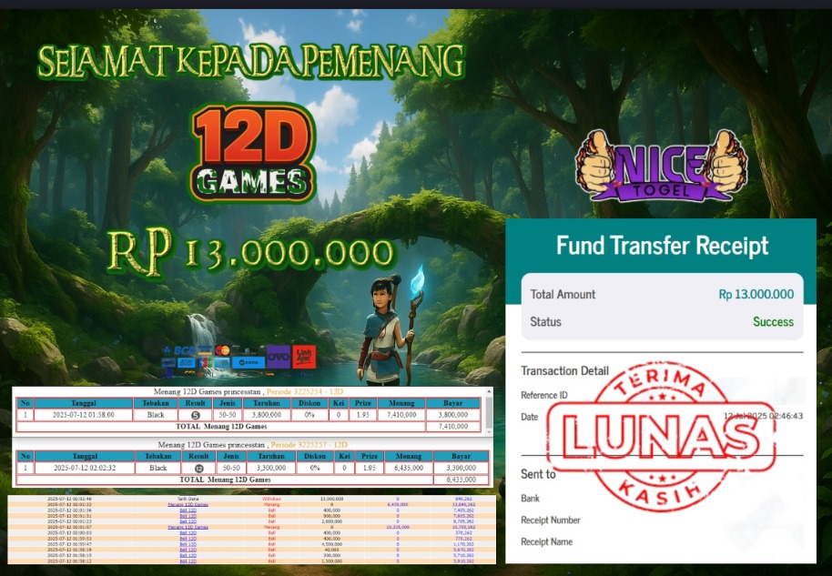 Selamat kepada User id : KRES*** Telah berhasil mendapatkan kemenangan besar pada permainan JACKPOT LIVE GAMES 12D Dengan kemenangan Sebesar Rp.13.000.000,- Setelah mengisi formulir withdraw dengan kurung waktu hanya 5 – 10 menit pihak NICETOGEL sudah melakukan transfer kepada pemilik Userid dan dana sudah dapat di cairkan oleh pemenang. Bukti pembayaran yang kami berikan merupakan bukti pembayaran yang SAH / VALID yang langung di dapatkan melaui tanda transfer transaksi dari Bank yang di tuju.