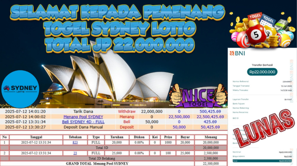 Selamat kepada User id : bay***n Telah berhasil mendapatkan kemenangan besar pada permainan JACKPOT LIVEBUKTI JACKPOT TOGEL SYDNEY LOTTO Rp 22.000.000,- LUNAS Dengan kemenangan Sebesar Rp.22.000.000,- Setelah mengisi formulir withdraw dengan kurung waktu hanya 5 – 10 menit pihak NICETOGEL sudah melakukan transfer kepada pemilik Userid dan dana sudah dapat di cairkan oleh pemenang. Bukti pembayaran yang kami berikan merupakan bukti pembayaran yang SAH / VALID yang langung di dapatkan melaui tanda transfer transaksi dari Bank yang di tuju.