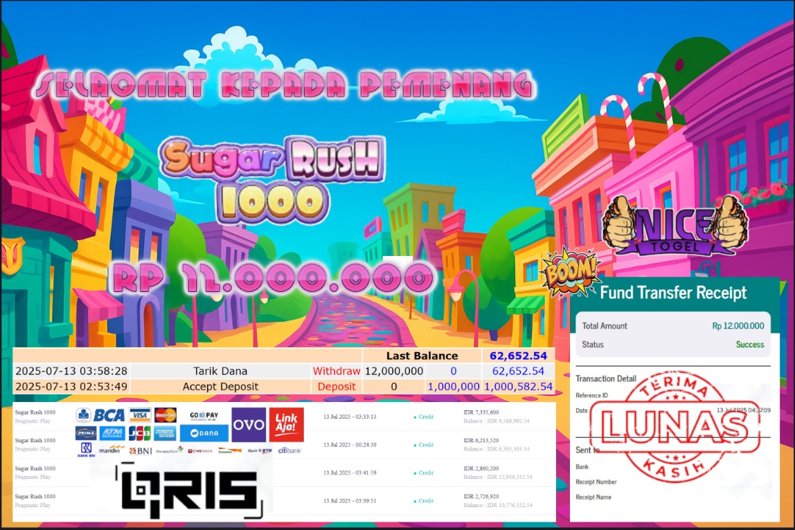 Selamat kepada User id : PIYS*** Telah berhasil mendapatkan kemenangan besar pada permainan JACKPOT SLOT SUGAR RUSH 1000 Dengan kemenangan Sebesar Rp.12.000.000.00,- Setelah mengisi formulir withdraw dengan kurung waktu hanya 5 – 10 menit pihak NICETOGEL sudah melakukan transfer kepada pemilik Userid dan dana sudah dapat di cairkan oleh pemenang. Bukti pembayaran yang kami berikan merupakan bukti pembayaran yang SAH / VALID yang langung di dapatkan melaui tanda transfer transaksi dari Bank yang di tuju.