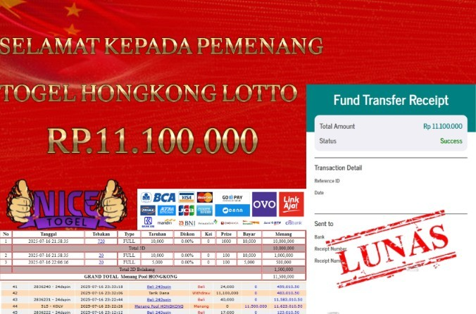 Selamat kepada User id : BAK2** Telah berhasil mendapatkan kemenangan besar pada permainan JACKPOT TOGEL HONGKONG LOTTO Dengan kemenangan Sebesar Rp.11.100.000.00,- Setelah mengisi formulir withdraw dengan kurung waktu hanya 5 – 10 menit pihak NICETOGEL sudah melakukan transfer kepada pemilik Userid dan dana sudah dapat di cairkan oleh pemenang. Bukti pembayaran yang kami berikan merupakan bukti pembayaran yang SAH / VALID yang langung di dapatkan melaui tanda transfer transaksi dari Bank yang di tuju.