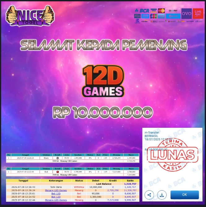 Selamat kepada User id : DAE** Telah berhasil mendapatkan kemenangan besar pada permainan JACKPOT 12D SPIN LIVE GAME Dengan kemenangan Sebesar Rp.10.000.000,- Setelah mengisi formulir withdraw dengan kurung waktu hanya 5 – 10 menit pihak NICETOGEL sudah melakukan transfer kepada pemilik Userid dan dana sudah dapat di cairkan oleh pemenang. Bukti pembayaran yang kami berikan merupakan bukti pembayaran yang SAH / VALID yang langung di dapatkan melaui tanda transfer transaksi dari Bank yang di tuju.